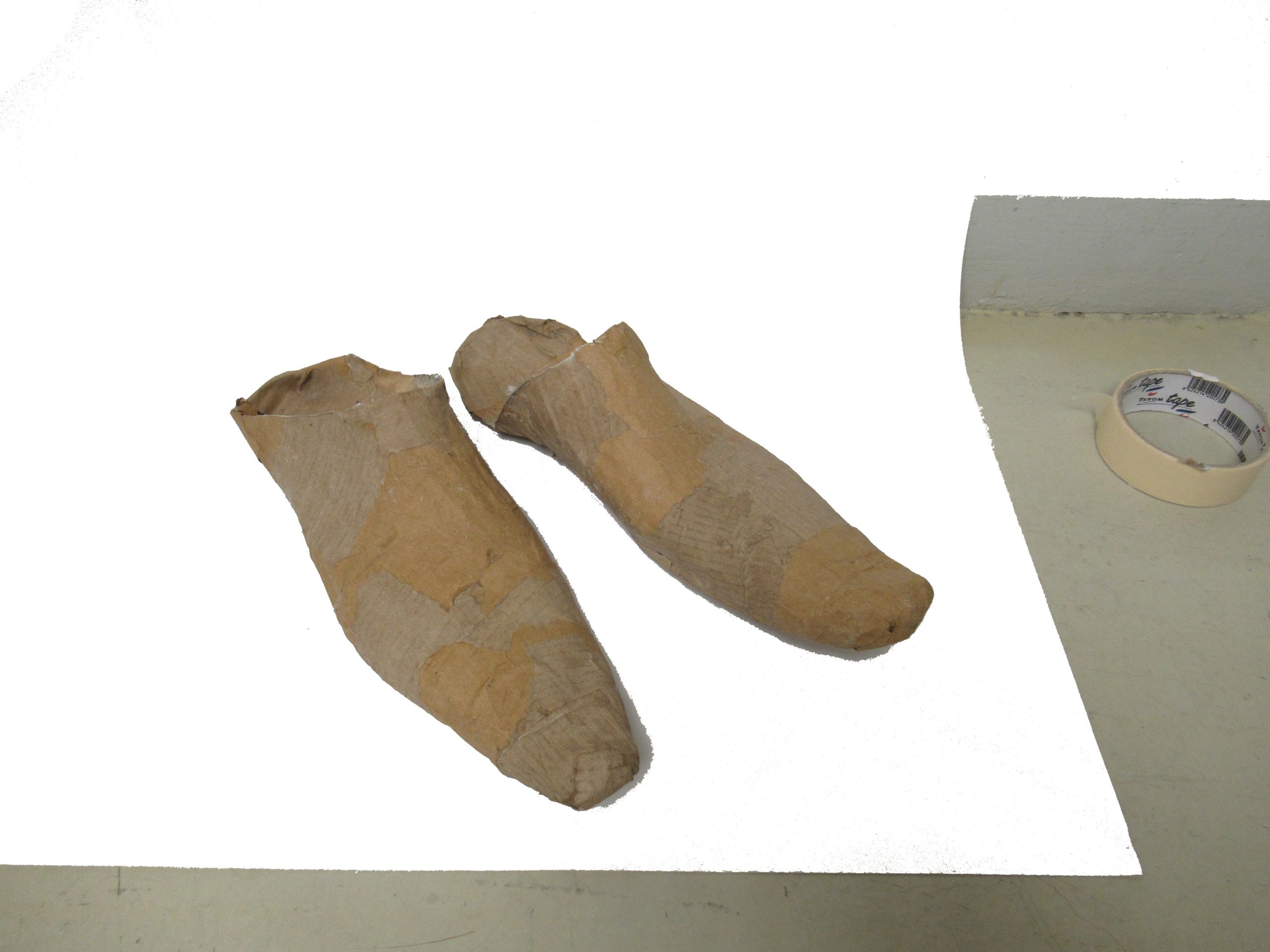 Propuesta de zapatos hechos a partir de material de construcción y cuerpos vestidos para instalación en Emma Pardos Store.